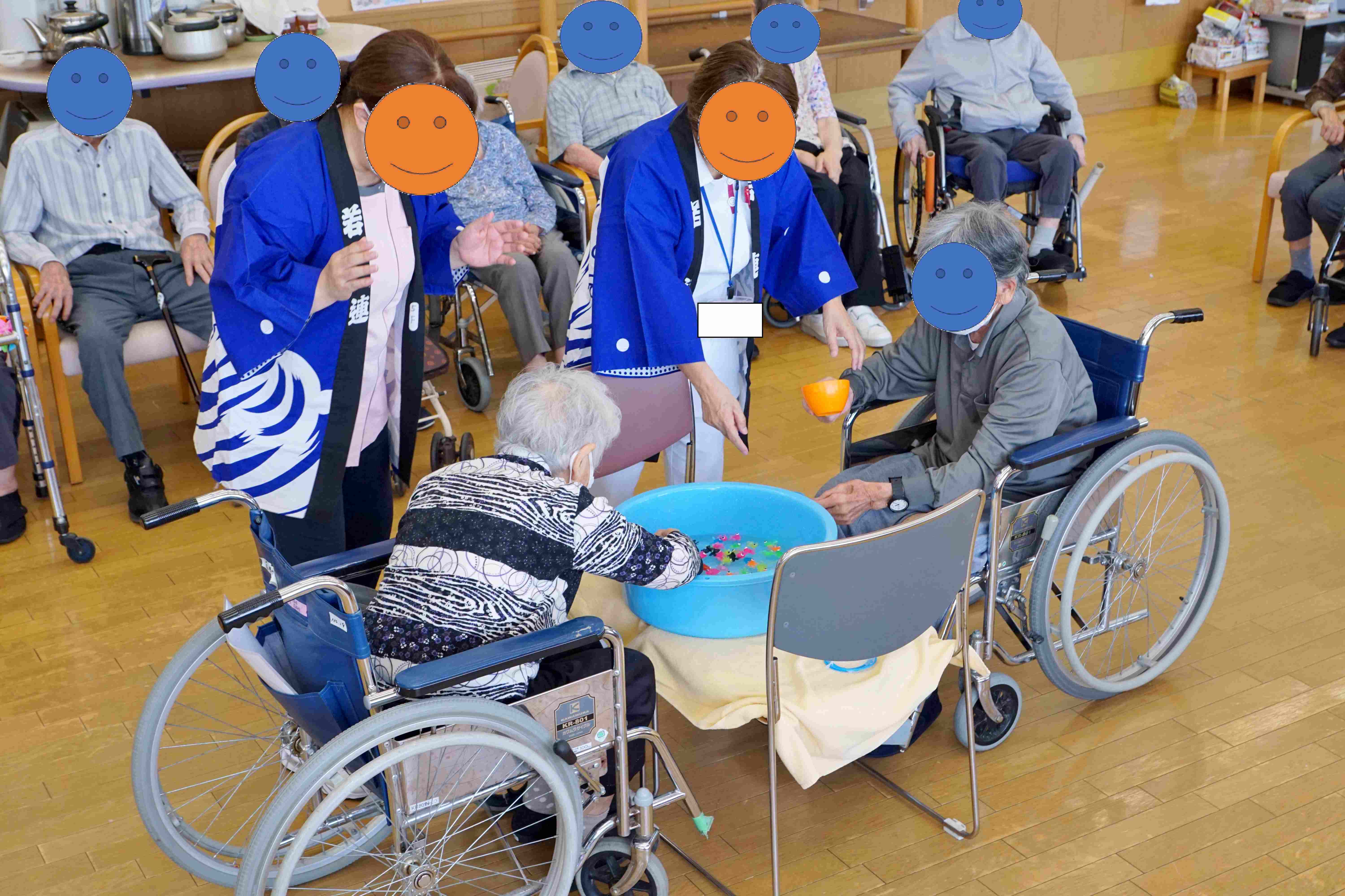 令和7年8月19日に納涼祭を行いました。職員と共に盆踊りを踊りました。炭坑節と東京音頭を踊り懐かしい雰囲気を味わいました。金魚すくいゲームも楽しまれ実際の金魚ではないですが上手く金魚をすくえた方やすぐにポイに穴があいてしまった方もおりました。軽食には焼きそばとクリームソーダを食べました。楽しかったので今後も続けてほしいと言われていた方もいました。