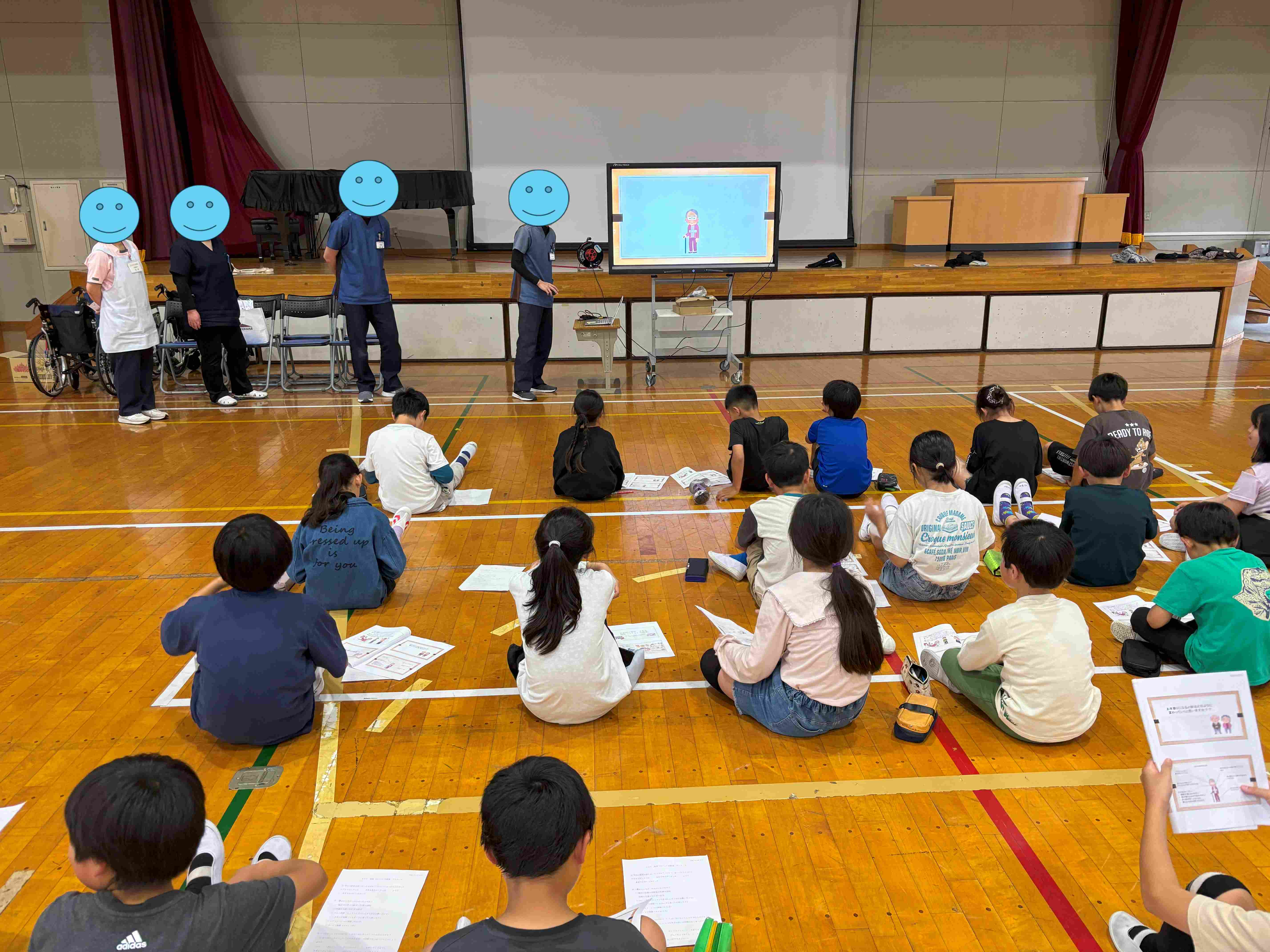 6月11日(水)5時間目に授業に行ってきました。松井田小学校4年生に施設紹介や職業紹介、高齢者の特徴についてなど講義させていただきました。職業紹介では医師や看護師、リハビリの専門職や管理栄養士など説明させていただきました。将来看護師になりたいという生徒さんもいたので嬉しく思いました。授業の後半には看護福祉体験を実施し4つのブースに分かれ体験して頂きました。1つは車椅子体験として車椅子を操作してみる体験や実際に押して介助してみる体験もしました。2つ目の看護体験では血圧測定や聴診器を使って心音を聴く体験もしました。3つ目はリハビリ体験としてストレッチ前後での体の柔軟性の比較を体験して頂きました。4つ目はレクリエーション体験として輪投げを体験して頂きました。熱心に授業を聞いて、体験して頂きました。積極的に質問をしていただく場面もあり4年生の生徒の皆様には感心しました。事前準備や当日ご協力いただいた学校の先生方にも感謝申し上げます。