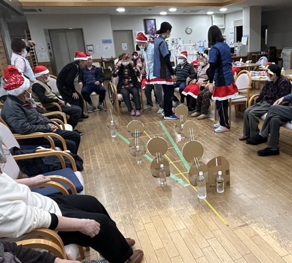 12月25日(月)~27日(土)にかけて、今年最後の行事であるクリスマス会を実施しました!歌は「もみの木」と「きよしこの夜」を選曲、皆さん楽しそうに歌われていました。ゲームはサンタクロースをピンに模したボーリングを工夫した内容でした。「がんばって!」等、皆さん大変盛り上がっていました。軽食はロールケーキでクリスマスケーキを表現しました。好評をいただいております。また、クリスマスプレゼントとして職員がマスコットなどを作成し、くじ引きの要領で利用者様へプレゼントをし、皆さんとても喜ばれていました。
